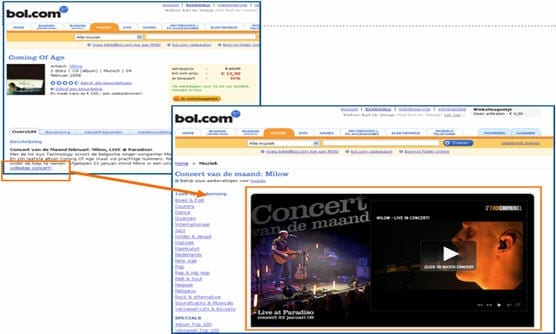 Door relevante en inspirerende content te bieden hoopt Bol.com bezoekers te trekken. Een lang leven lijkt deze samenwerking niet te beschoren nu ondertussen bekend is geworden dat Fabchannel (om andere redenen) deze maand ophoud te bestaan. De gedachtegang is evengoed interessant. Bol.com toont duidelijk de intentie om een stap verder te gaan dan het bieden van uitvoerige productinformatie. Bezoekers wordt content geboden die op zich zelf waarde heeft. Daarmee verandert Bol.com van slechts een winkel waar je (onder andere) CD’s kunt kopen in een plek waar je als muziekliefhebber terecht kunt om muziek te luisteren en te bekijken. Het einddoel blijft uiteraard onveranderd: CD’s verkopen!