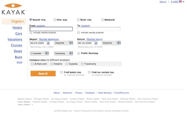 Kayak doorzoekt honderden reissites over de hele wereld. Alles wordt in éen overzicht gepresenteerd. Uiteraard kun je verfijnen tot je de juiste aanbieding hebt gevonden. Vervolgens verwijst Kayak je naar de reissite in kwestie. Kayak heeft geen eigen voorraad aan reizen, maar verwijst enkel door en verdient zijn geld net zoals Google dat doet, met de klikjes van de gebruikers.