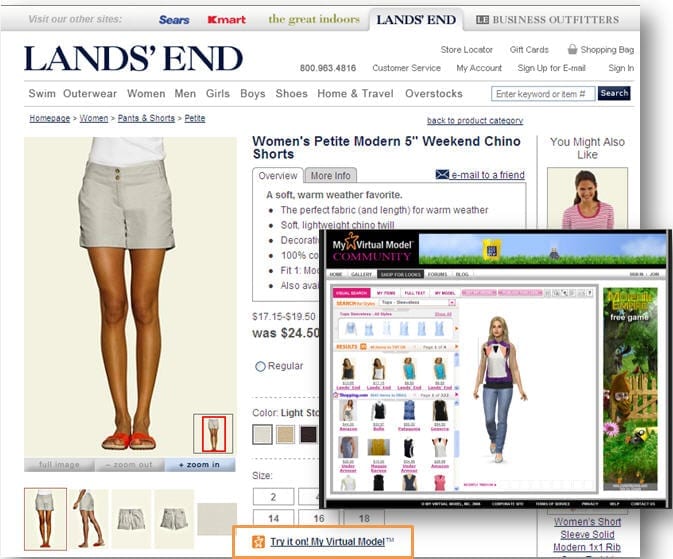 Lands’ End biedt gebruikers de mogelijkheid om een kledingstuk te passen bij My Virtual Model, een community waar gebruikers hun eigen profiel en model aanmaken. Door het model dezelfde lichaamsbouw te geven, kunnen shoppers kijken hoe kledingstukken en accessoires zullen staan. Daarnaast kunnen gebruikers naar hartenlust combinaties maken en voorkeuren delen.