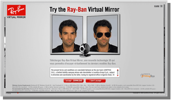 Ray Ban gaat nog een stap verder om een paskamer met spiegel te simuleren. Door gebruik te maken van augmented reality toveren gebruikers hun monitor om tot spiegel en kunnen zij eindeloos brillen passen. Niet langer slechts turen naar statische plaatjes maar echt zien of een bepaalde zonnebril bij je past. Voor velen zal augmented reality vooral als toekomstmuziek klinken, het enige wat je nodig hebt is een webcam. De mogelijkheden zijn daarentegen eindeloos: het verandert de webshop in je persoonlijke paskamer.