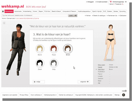 Bij Wehkamp.nl geeft mode-icoon Dyanne Beekman bezoekers kledingtips op basis van haarkleur, lichaamsbouw en persoonlijke kledingsmaak. En na het geven van het stijladvies worden er uiteraard producten getoond die hier bij aansluiten. Daarnaast biedt Wehkamp.nl ook een maatassistent waarmee gebruikers kunnen bepalen welke maat ze nodig hebben. Extra ondersteuning voor de klant, en het scheelt Wehkamp retouren.