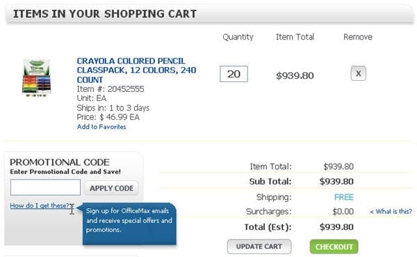 In de winkelmand van Officemax wordt het ‘promotional code’-veld prominent getoond. Gemakkelijk voor de bezitters ervan. Maar een deel van het overige bezoek zal ernaar op zoek gaan. Via het linkje ‘how do I get these?’ probeert Officemax de bezoeker nog binnen te houden, én te verleiden tot een nieuwsbriefinschrijving. Zodat in ieder geval bij een volgend bezoek de door Officemax zelf verstrekte promocode wordt gebruikt in plaats van de (voor Officemax) duurdere affiliate variant.