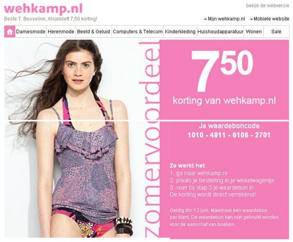 Bij Wehkamp komt de kortingscode pas in de derde stap van het bestelproces in beeld. Op dat moment heeft de shopper zijn persoonlijke gegevens al ingevuld. De kans is hierdoor kleiner dat hij of zij van de koop afziet als geen promocode wordt gevonden. Bovendien zal de benaming ‘waardebon’ minder appelleren aan het gevoel iets mis te lopen dan een ‘kortingscode’ of de ‘couponcode’ van Bol.com.