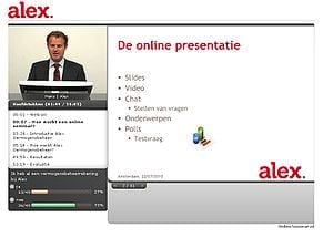 Om 8 uur ’s avonds precies start Alex presentator Jordi Franken vanuit hun nieuwe kantoor het seminar ‘Kennismaking Alex zelfbeleggen’. De ruim 100 deelnemers zijn in de minuten ervoor vanuit huis ingelogd. Ze krijgen zowel de presentator als de slides van het komende uur te zien. Jordi heet iedereen van harte welkom en begint met een korte uitleg van de werking van een online seminar. Wanneer om 2 over 8 gebruiker ‘persekens’ met “hoe lang duurt dit seminar ongeveer?” zorgt voor de eerste vraag van de avond, is het seminar echt begonnen….