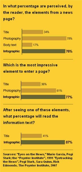 - Ze hebben een hoge attentiewaarde. Eyetracking onderzoek onder lezers van nieuwssites (2007) toont aan dat infographics en foto’s op nieuwspagina’s een nagenoeg even hoge attentiewaarde hebben. En bij het zien van een infographic blijkt ruim 87% van de bezoekers de bijbehorende tekst te lezen. Bij een ‘gewone’ titel-tekstpagina gaat gemiddeld 41% over tot het lezen van de tekst.