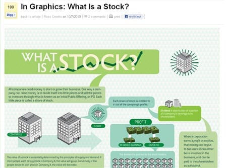 Mint.com is een hip online boekhoudpakket voor particulieren. Met allerlei tools en dashboards kun je je eigen financiële situatie volgen en bijsturen. Om klanten wegwijs te maken in de wereld van persoonlijk financiën heeft Mint.com een weblog. Dit weblog staat vol met infographics die allerlei financiële principes en theorieën begrijpelijk uitleggen. Zo heeft Mint.com een zeer begrijpelijke infographic die uitlegt wat een aandeel is en hoe de aandelenmarkt werkt.