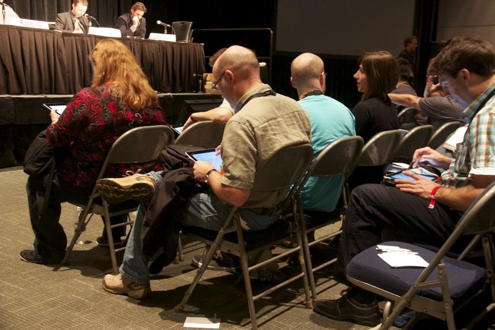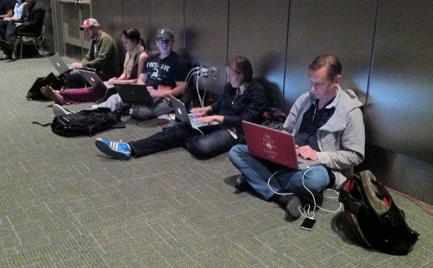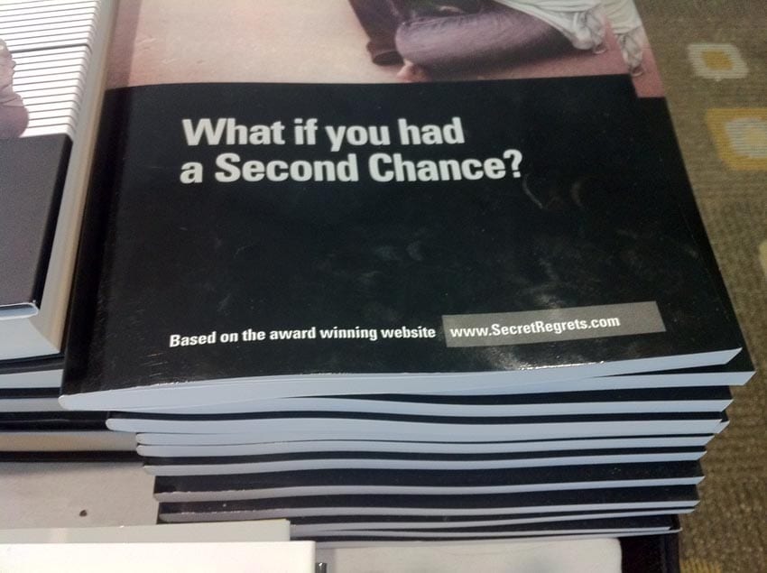 SWi heeft wel wat weg van de Lowlands University op het gelijknamige festival waar ook mensen bij elkaar komen in een bijzondere sfeer, ergens op het snijvlak van entainment en professionalisme. Door het hele Austin Convention Center zitten mensen op de grond met een laptop of iPad op schoot, liefst een koptelefoon ingeplugd en een beker koffie bij de hand. De connected world zoals Amerikanen dat zo mooi kunnen zeggen is nergens zo voelbaar als hier. Bij een doorsnee panel zie je de Twitterfeed vollopen met een tweet iedere seconde. Tijdens de panels is het merendeel van de gezichten dan ook gericht op de eigen iPad, MacBook of iPhone. Tekenend voor de sfeer op SXSW is het boek ‘What if you had a Second Chance? Based on the award winning website www.secretregrets.com” Oftewel: het web is leading en de fysieke wereld reageert.