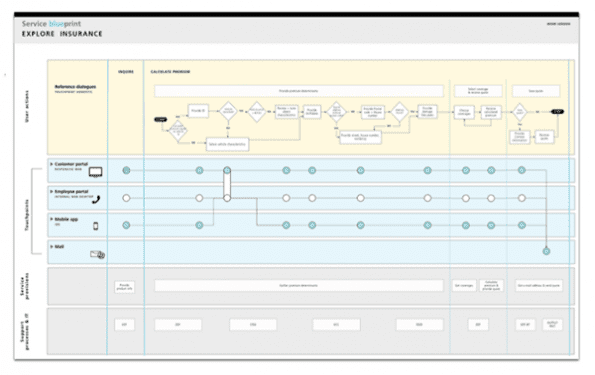 Hoewel de klant nog steeds centraal staat in een Service Blueprint wordt er bijvoorbeeld ook gekeken naar de back-end van organisaties en systemen. Een vaak vergeten, maar essentiële factor voor een succesvolle dienstverlening. Ook de touchpoints tussen de gebruiker en organisatie of dienst spelen een belangrijke rol in de blauwdruk, mede omdat naarmate dienstverlening steeds directer en breder toegankelijker wordt, de verschillende touchpoints en kanalen goed op elkaar afgestemd moeten worden.