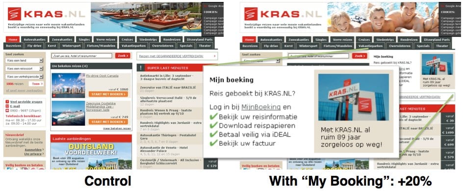 De testvariant leverde 20% meer verkochte reizen via de homepagina op. Waarom? Uiteraard omdat de variant groene vinkjes gebruikt, de autoriteit van Kras (al 89 jaar) benadrukt en woorden als ‘zorgeloos’ gebruikt. Maar wellicht dat de relatief oudere doelgroep ook ‘zekerder’ is van de uitkomst van het boeken bij Kras.nl: “Ik krijg gewoon de reispapieren en dergelijke die ik gewend was”.