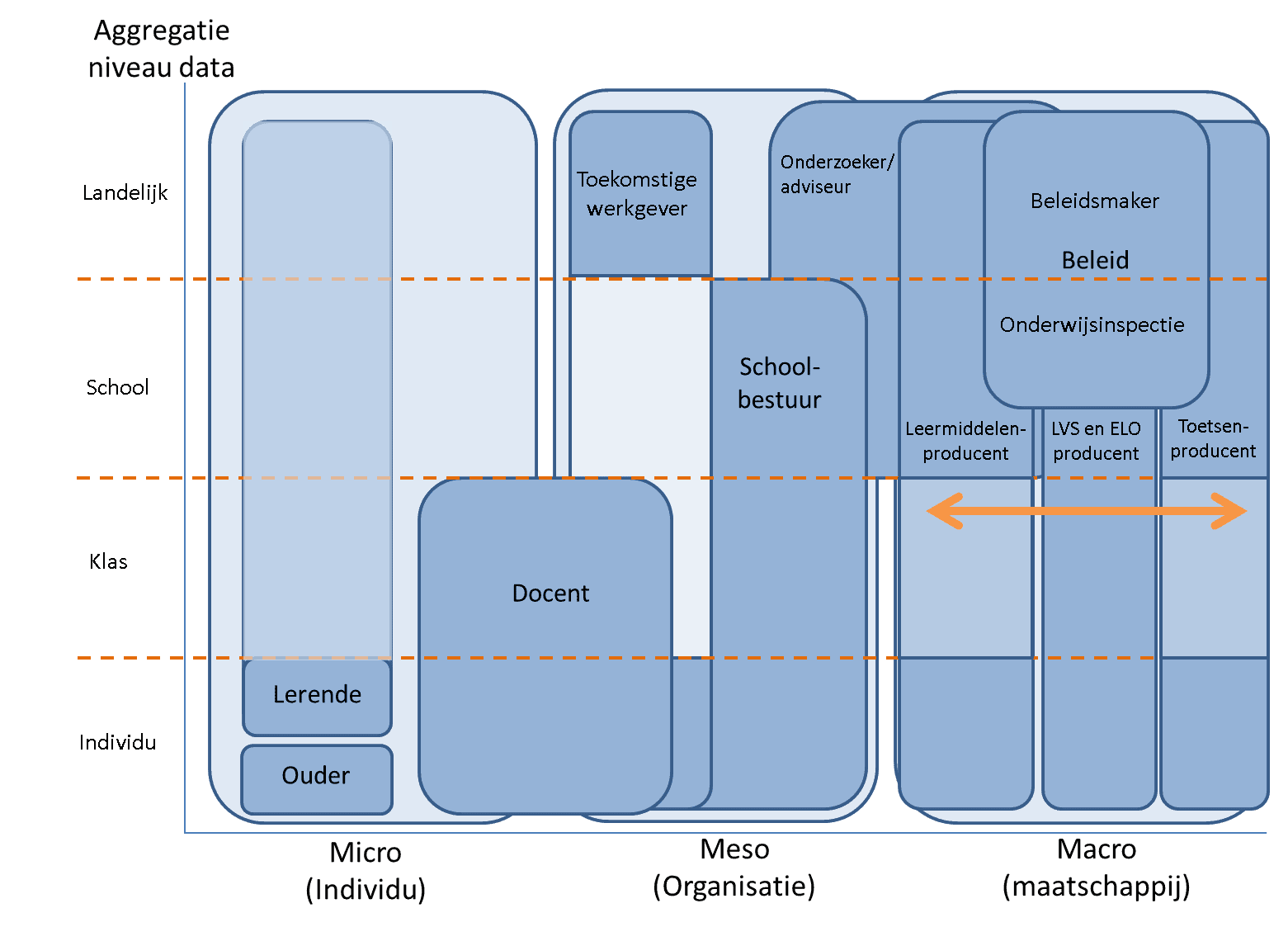 Primair zijn het de lerenden en hun docenten. Maar wie een laagje dieper kijkt, ziet dat learning analytics bijvoorbeeld ook een interessante beleidstool kan zijn voor schoolbestuurders en beleidsmakers en daarnaast een effectieve bron van feedback voor leermiddelenproducenten. De afbeelding hieronder geeft een overzicht van de belangrijkste stakeholders van learning analytics, het niveau waarop zij bij het leerproces betrokken zijn (horizontale as) en het aggregatieniveau waarop zij de data willen hebben (verticale as).