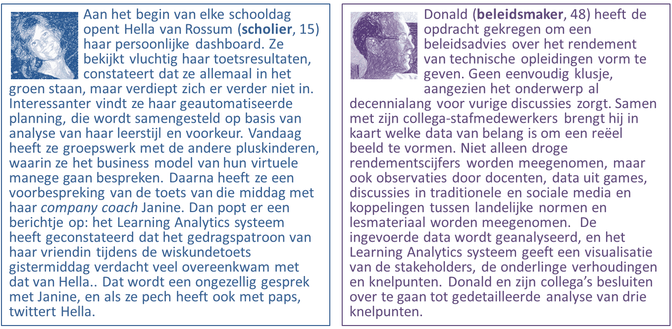 Vanuit de verschillende individuen creëerden we scenario’s waarin learning analytics optimaal werd ingezet. De toekomst schitterde ons tegemoet. (Zie afbeelding hieronder, neem voor de andere drie scenario’s contact op met de auteurs.)