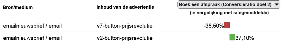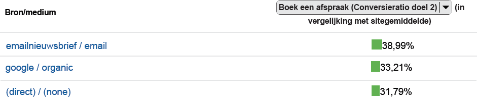 - Wat is het klikgedrag geweest op verschillende edities en/of elementen binnen je e-mailings? En belangrijker: het vervolg op de landingspagina of website? Uit onderstaande Analytics-statistieken kun je opmaken dat campagnes zeer uiteenlopend presteren als het gaat om het maken van een afspraak. Leg dit naast de verstuurde e-mailing(s) en bepaal wat voor jouw ontvangers het beste werkt. Hetzelfde geldt voor de afzonderlijk linkende elementen.