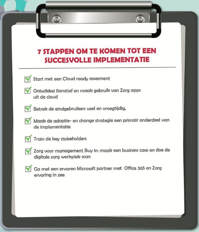 Nu De Nederlandse Bank (DNB) Office 365 heeft goedgekeurd voor financiële instellingen, zullen zorginstellingen meer vertrouwen hebben in de maatschappelijke acceptatie van Cloud, ook al liggen de twee branches mijlenver uit elkaar. De eerste reactie op Cloud binnen de zorg heeft doorgaans met patiëntgegevens te maken. Het platform waar we in dit artikel over hebben, slaat geen formele patiëntgegevens op, maar alleen cliëntgerelateerde gegevens, die wel met verzorging te maken hebben, maar niet met de geneeskundige behandeling. Deze gegevens zouden in het elektronisch cliëntendossier behoren te staan. Dit systeem kan via de portal dan weel toegankelijk gemaakt worden, hoewel sommige zorginstellingen ook deze systemen al in de Cloud hebben staan of bezig zijn om deze te realiseren.