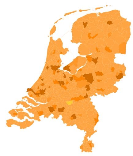 Een analyse op de auteurslocatie (zoals deze in de bio op het Twitterprofiel staat) laat in lijn met de verwachtingen zien dat de berichten vooral uit de grote steden komen. Het gesprek lijkt daarmee in heel Nederland gevoerd te worden. Hoe donkerder het oranje, des te groter het gesprek. De zoektocht naar de meest oranje-gezinde gemeente (het aantal berichten per inwoner) bewaren we voor de troonwisseling!