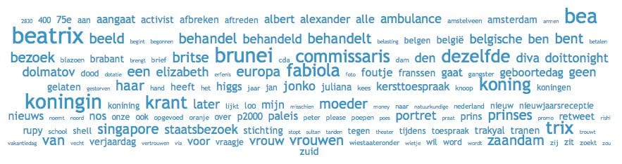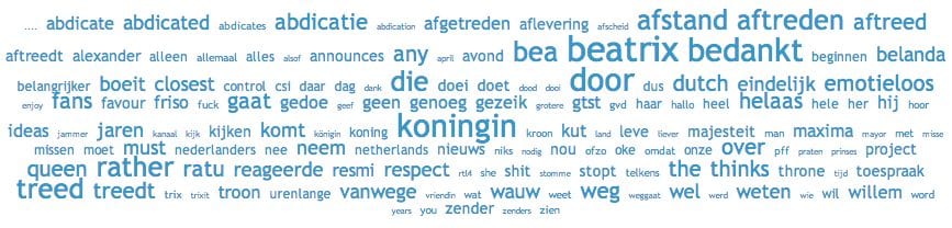 Voor deze analyse zijn alle berichten op online media (dus ook nieuwsites, blogs, reacties, etc.) waarin de volgende woorden voorkwamen verzameld: Beatrix, toespraak, aftreden, Maxima, Willem Alexander en 27 april.