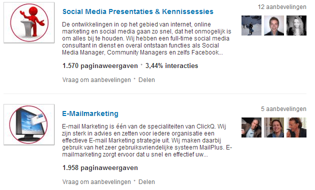 Binnen LinkedIn zien de aanbevelingen er professioneel uit. LinkedIn biedt echter ook de mogelijkheid om real-time het aantal aanbevelingen per product of dienst op je website uit te lichten.