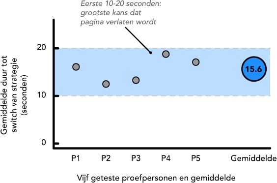 In het huidige onderzoek laten we zien dat, wanneer content op een pagina niet opvallend genoeg is om in één oogopslag gevonden te kunnen worden, het meer dan vijftien seconden kan duren totdat deze locatie opnieuw bekeken wordt. In 2010 concludeerden C. Liu en zijn collega-onderzoekers dat de kans om een website te verlaten het grootst is in de eerste 10 tot 20 seconden (aangegeven in figuur 4 door middel van de lichtblauwe balk).
