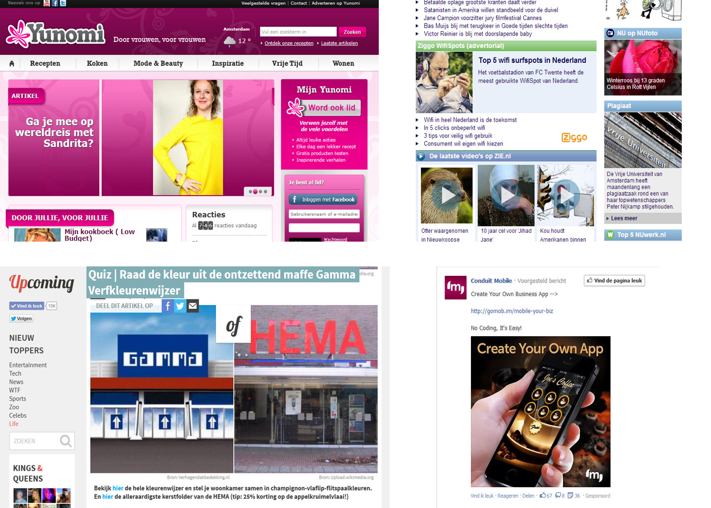 Daarom waren contentmarketing en ‘native’ advertising de marketing buzzwords van 2013: het alternatief voor de afnemende effectiviteit van push-reclame. Daarmee proberen adverteerders iets toe te voegen aan de online ervaring van consumenten. Ze worden daarbij gedwongen een goede balans te vinden tussen wat de consument zou willen horen, zien, ervaren of delen en wat de adverteerder zelf wil vertellen. Hieronder een aantal voorbeelden. Yunomi (Unilever), een (mislukte) Upcoming-editie met Hema en Gamma, een advertorial van Ziggo op Nu.nl en natuurlijk een Facebook newsfeed ad.