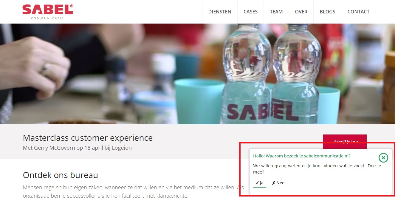 Je moet een pop-up op je website plaatsen. Netlife koos voor een pop-up die rechts onderin het scherm verschijnt, en dus niet de hele pagina verbergt. Ook is het mogelijk om de pop-up slechts aan een deel van de bezoekers te tonen. Maar het is nog steeds een pop-up die bezoekers in de weg kan zitten.