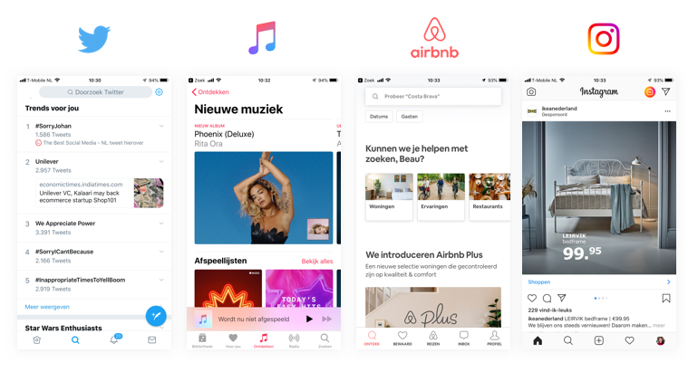 Door alle geweld hierboven (en hieronder) zou je bijna niet opmerken dat er ook een totaal minimalistische trend gaande is: het lijkt erop dat er in sommige gevallen helemaal niet meer ontworpen wordt: mobiele interfaces vrijwel zonder kleur, heel functioneel en met een paar ‘standaard’ iconen. Grote jongens als Twitter, Apple Music, Airbnb en Instagram gaan op de telefoon steeds meer op elkaar lijken. Het doet saai aan, maar eigenlijk is het heel fijn. Geen toeters en bellen en iedereen snapt hoe het werkt.