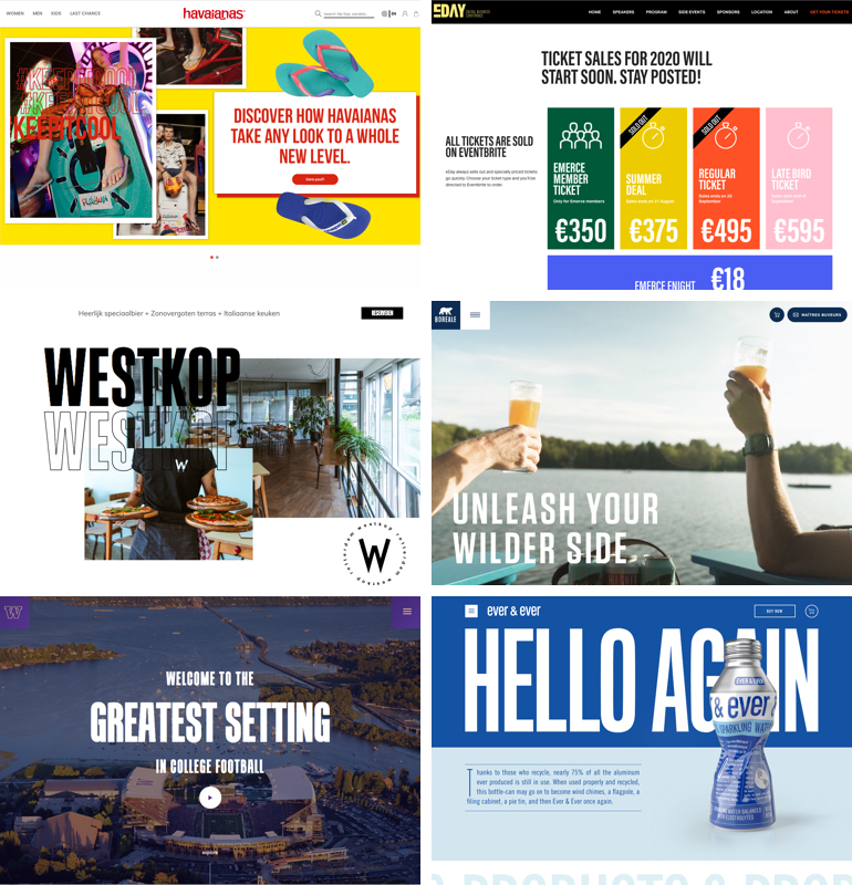 Design met een groots gebaar: enorme foto’s, vrolijke uitlijning, gigantische kopteksten in creatieve fonts. Geen pagina-gepriegel in een smal grid, maar opmaak tot ver voorbij de randen van het scherm, hoe groot ook. Met de mobile-first ontwikkelingen van de laatste jaren leek desktop totally uncool geworden. Maar we zien een herwaardering voor fors & flink: een website als dure modeglossy of coffee-table art book. Maar dan met animaties: het zoeft, glijdt en bubbelt. Zelfs tekst doet mee: kinetische typografie – woorden die rennen, springen, huppelen en dansen.