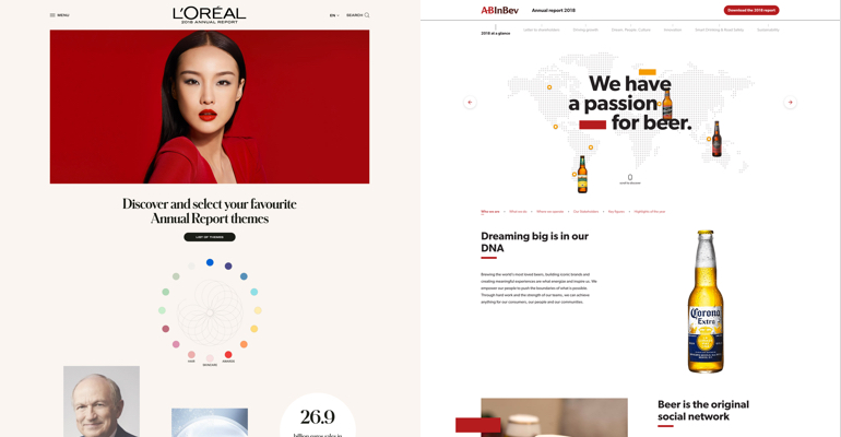 Een jaarverslag als glossy magazine kan prima. L’Oréal Paris en bierbrouwer Anheuser-Busch InBev (van Budweiser en Corona) maken hun annual report op met grote foto’s en vette headlines in een losse opmaak. Niks suf orakelende CEO’s en taaie tabellen. Je krijgt zin om te lezen: lekker jaarverslag bladeren bij een cappuccino alsof het de Linda is.
