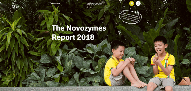 Het Deense Novozymes levert biologische grondstoffen, voor bijvoorbeeld waspoeder. Ze zetten in op duurzaamheid met een mooi ontworpen jaarverslagwebsite met goed beeld en veel beweging op scrollen.