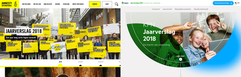 Jaarverslagen van Amnesty International (links) en KPN (rechts).