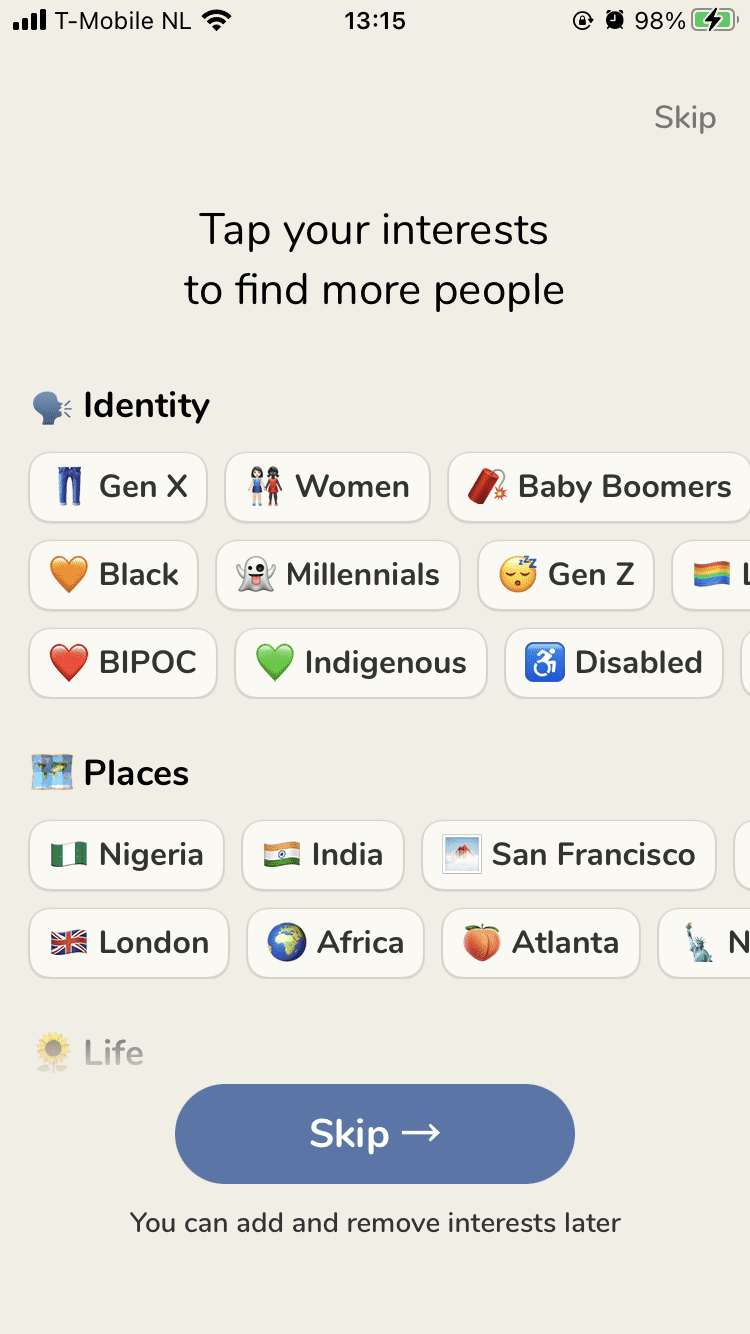Als je eenmaal van de wachtlijst af bent, een invite hebt gehad of er eentje via eBay hebt gekocht, kun je op zoek naar interessante gesprekken. Om je op weg te helpen kun je je interesses aangeven via de app. Daarna krijg je volg-suggesties voorgeschoteld gebaseerd op je aangevinkte interesses. Ik klikte op ‘Skip’ en kreeg daarna de onderstaande suggesties.
