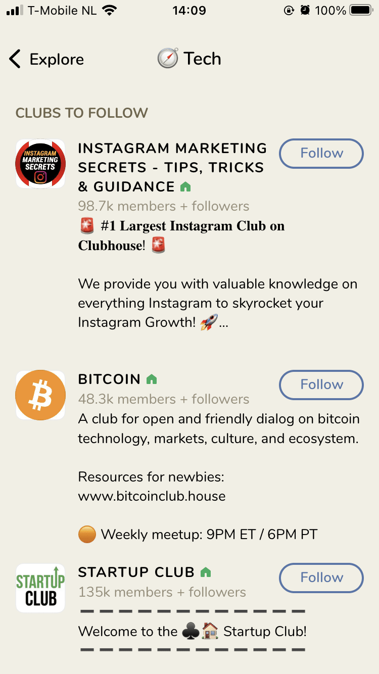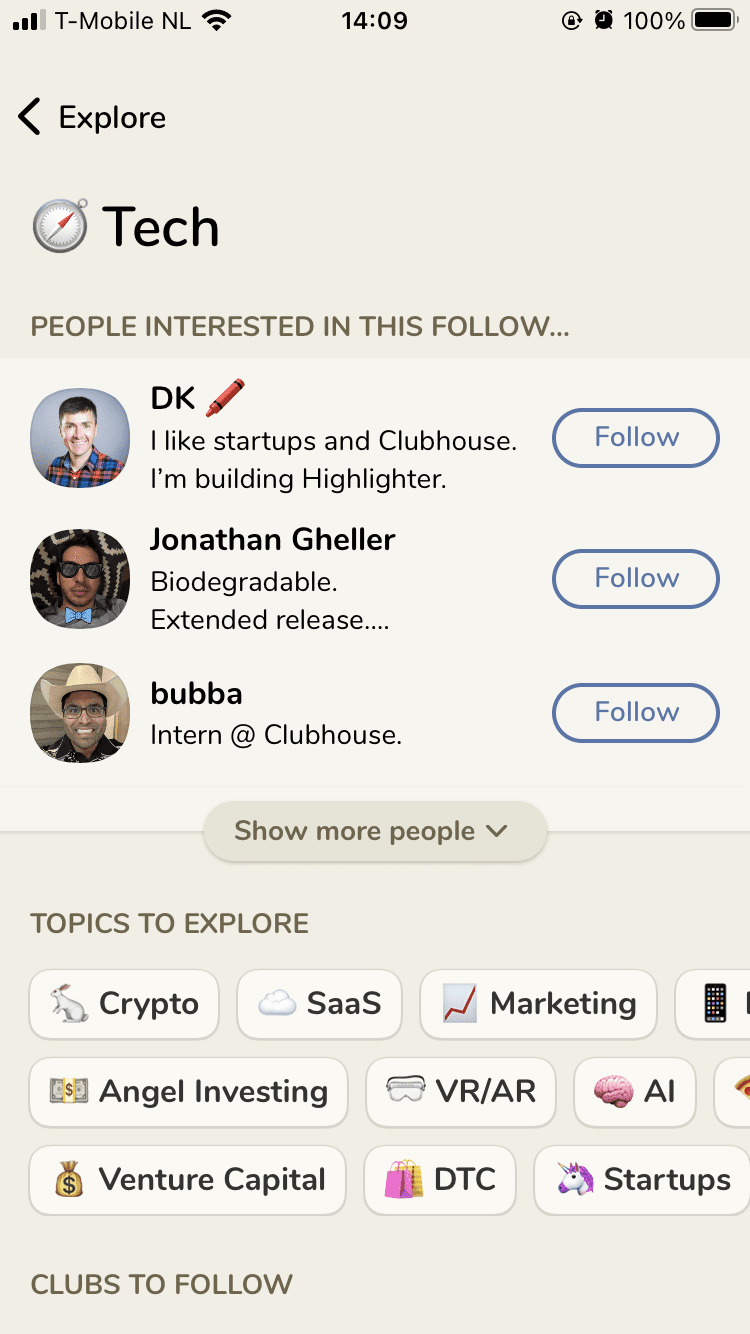 Naast de direct gedeelde luister-suggesties van de app zelf, kun je ook in de app ‘exploren’. Zo klikte ik bijvoorbeeld op ‘Find conversations about… Tech’, waarna ik een overzicht kreeg van interessante personen en topics om te volgen.