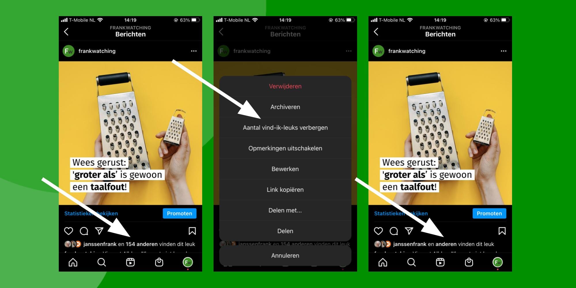Het verbergen van de likes op je eigen posts is simpel. Je plaatst de post, klikt op de drie puntjes rechtsboven in de post en vervolgens kun je klikken op ‘Aantal vind-ik-leuks verbergen’. Zodra je daarop hebt geklikt, staat er onder je post niet meer ‘Sanne en 154 anderen vinden dit leuk’, maar ‘Sanne en anderen vinden dit leuk’. Het is dan nog wel mogelijk om op en ‘anderen’ te klikken en ze handmatig te tellen.