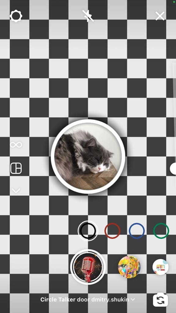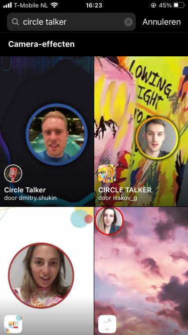 Je opent de camera voor een nieuwe Story. Vervolgens scrol je onderin je scherm de effecten helemaal naar rechts, totdat je het vraagteken ziet. Deze klik je aan, waarna je in de Effectengalerij zoekt naar ‘circle talker’.