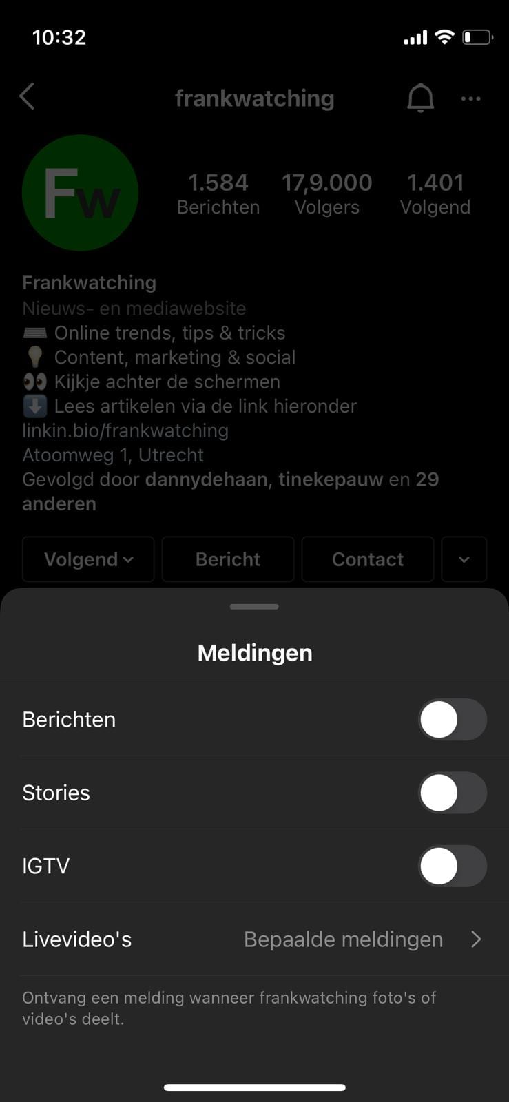 Meldingen voor specifieke berichttypen kun je ook aanzetten via een post of Story van diegene. Als voorbeeld: zie het rechter screenshot. Daarbij heb ik op de drie witte puntjes rechts bovenin de post geklikt. Vervolgens verschijnt het menu onderin, waar je kunt kiezen voor ‘Berichtmeldingen inschakelen’. Daarmee zet je meldingen aan voor berichten van dit account.