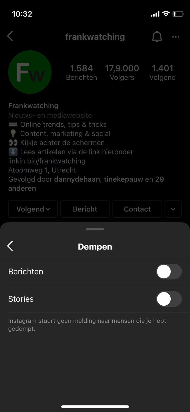 Als je op ‘Volgend’ hebt geklikt, komt het menu op het linker screenshot in beeld. Na een klik op ‘Uitschakelen’, krijg je het menu uit het middelste screenshot in beeld. ‘Uitschakelen’ klinkt dus iets heftiger dan wat het daadwerkelijk is: dempen. Hierbij kun je ervoor kiezen om de Stories of posts van het account te dempen. En zoals Instagram hieronder zelf ook aangeeft: ‘Instagram stuurt geen melding naar mensen die je hebt gedempt.’ Is dat even fijn 😉