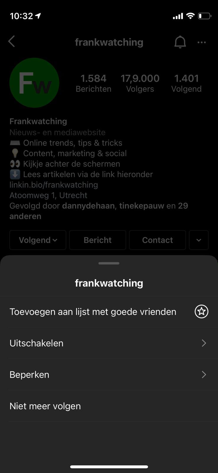 Het voelt misschien een beetje eng, maar je kunt zonder consequenties op het knopje ‘Volgend’ klikken van een account. Je ontvolgt dan namelijk niet direct dit account, en diegene krijgt hier dus ook geen melding van. Instagram laat je via deze knop namelijk eerst nog een paar andere opties zien.