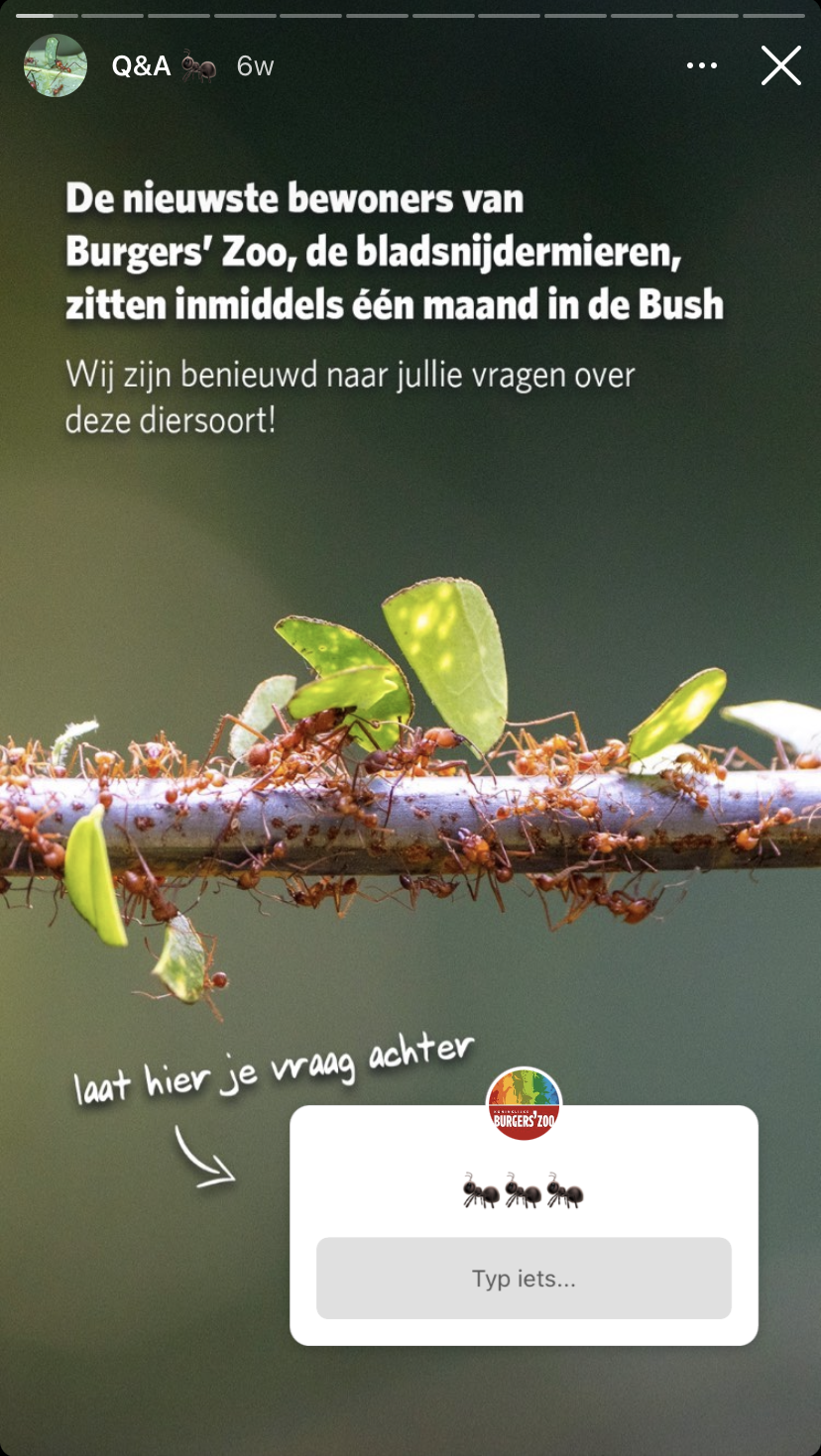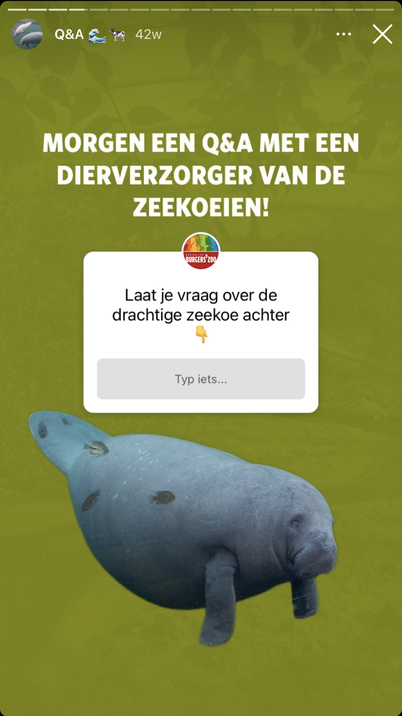 Je kunt dit in de vorm van een video doen, maar ook met mooie afbeeldingen. Inspiratie nodig? Zelf vind ik dat Burgers’ Zoo Q&A’s leuk aanpakt, met mooie visuals en af en toe antwoorden in videovorm.