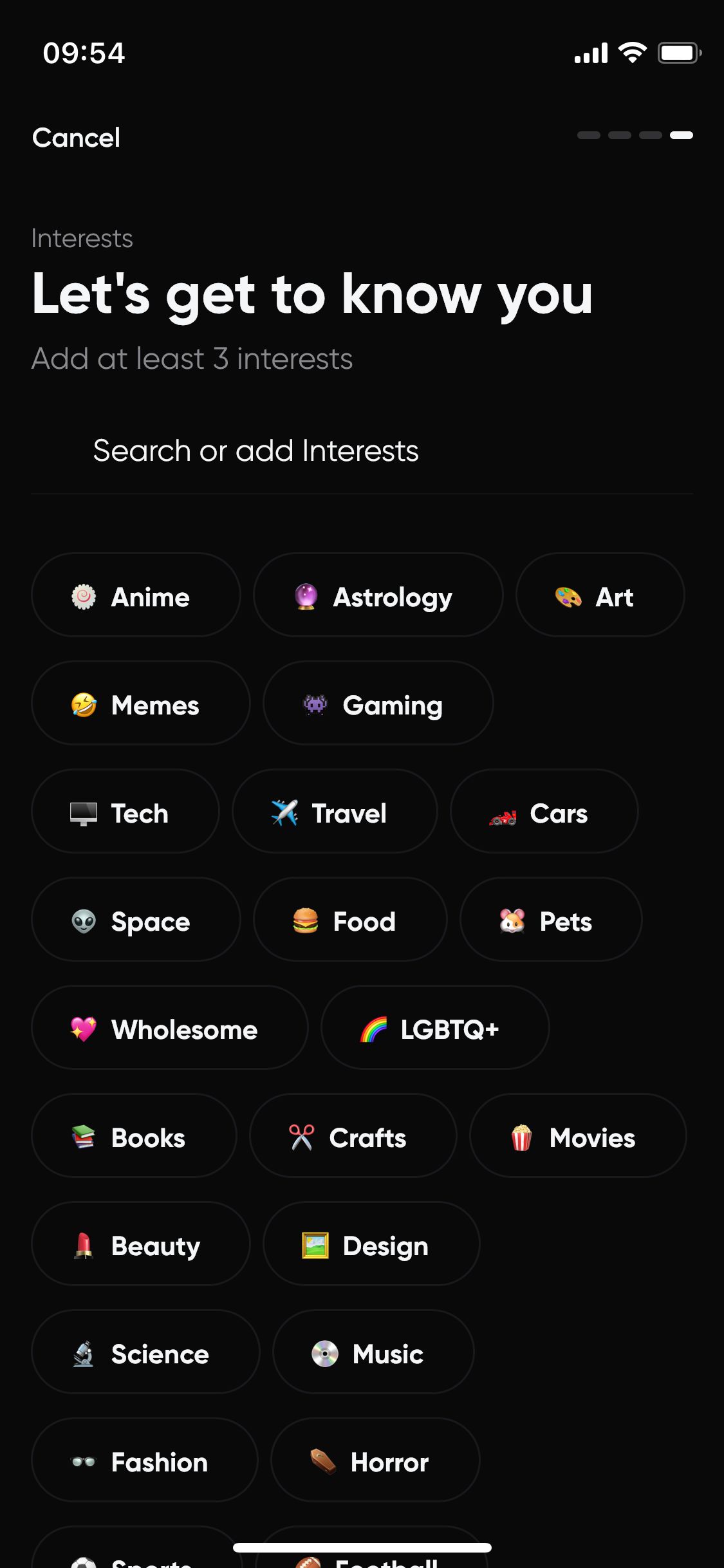 De volgende stap is het invoeren van je naam en schermnaam, en vervolgens klik je ‘at least’ 3 interesses aan (zie screenshot). Hierna heb je direct toegang tot de app. Het is een hele duidelijke app, met 5 menu-secties onderin: