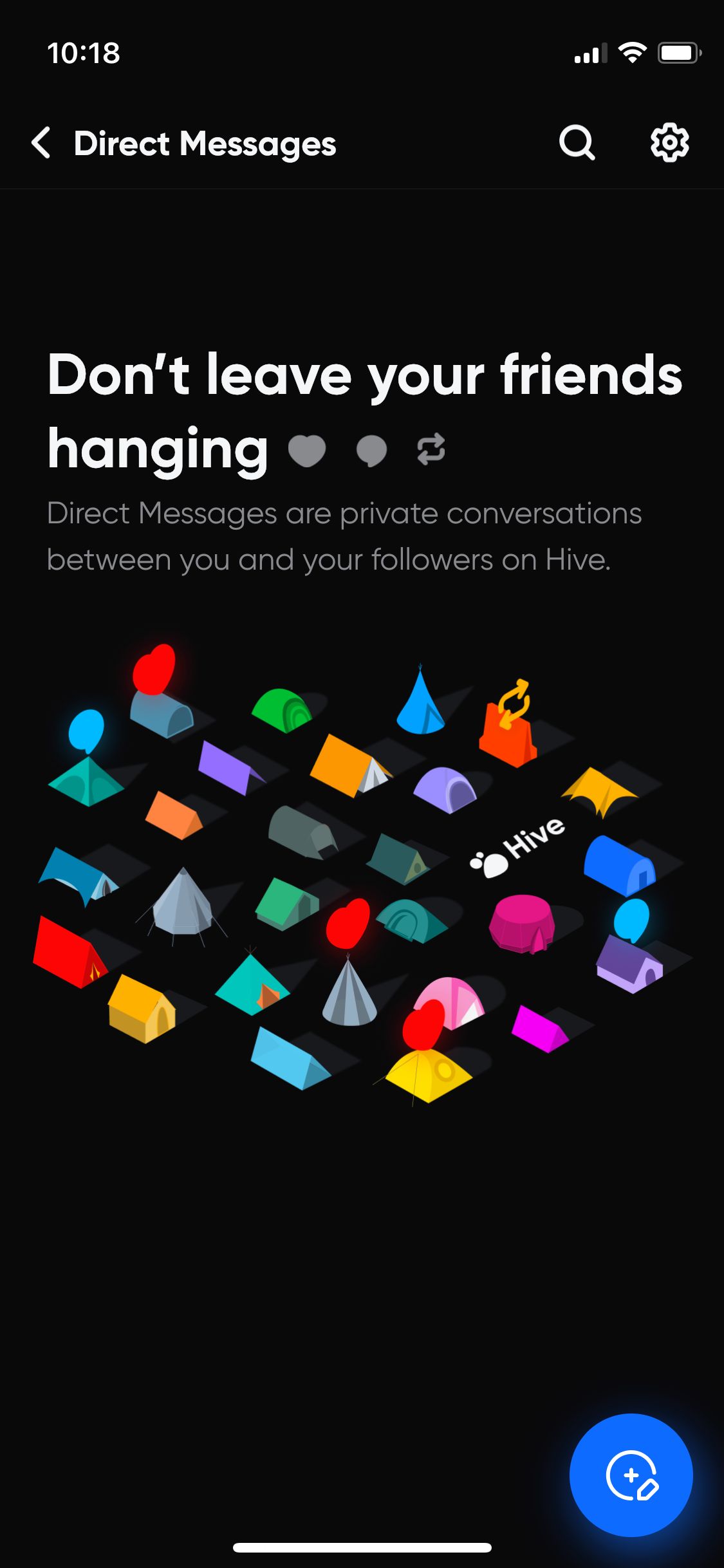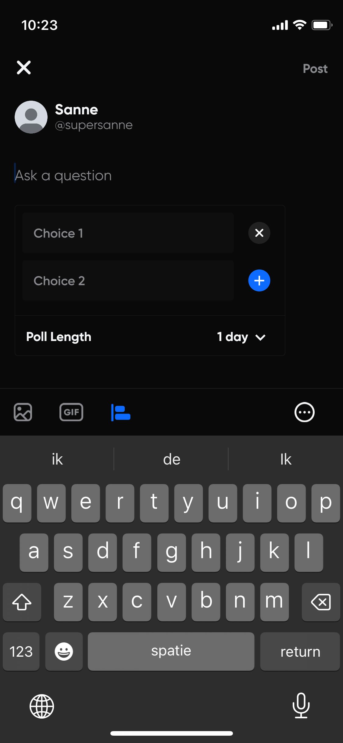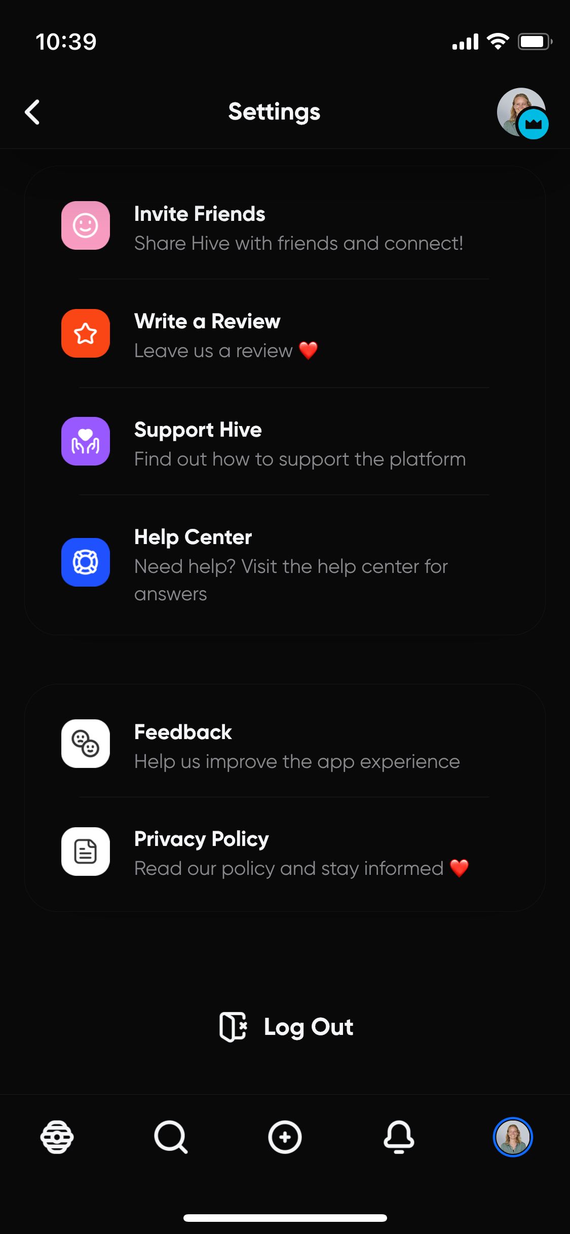 Via het plus-icoon kun je een update op Hive plaatsen. Deze functie doet mij meteen aan Twitter denken. Er komt een typevak in beeld met daarin de tekst ‘What’s on your mind?’. Hierin kun je tekst, afbeeldingen en/of een polletje plaatsen. Ook kun je bepalen wie er op jouw bericht kunnen reageren. Bijvoorbeeld alleen de personen die jij ook volgt.