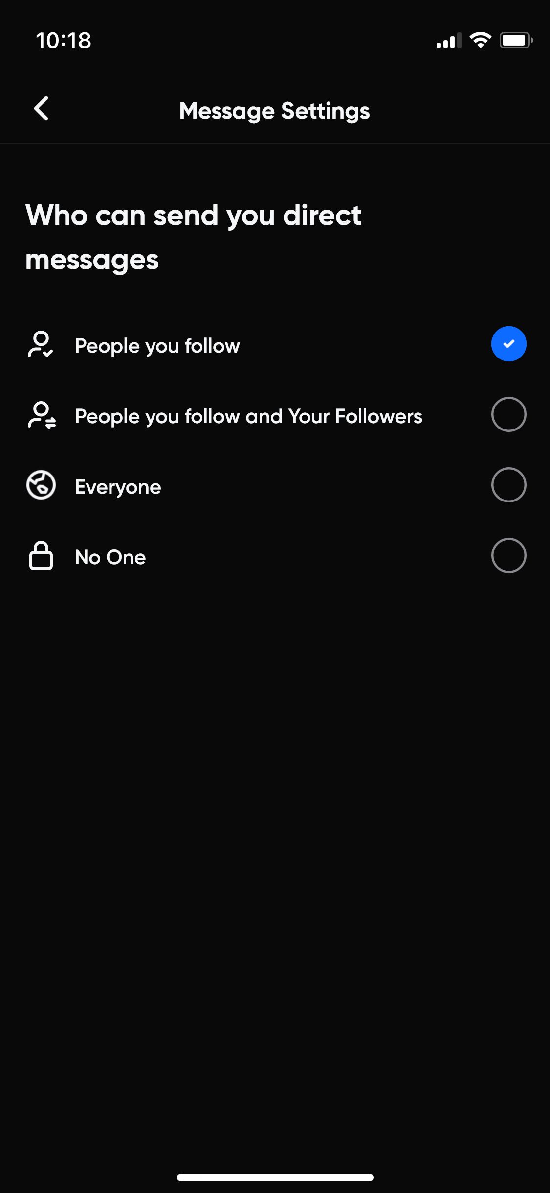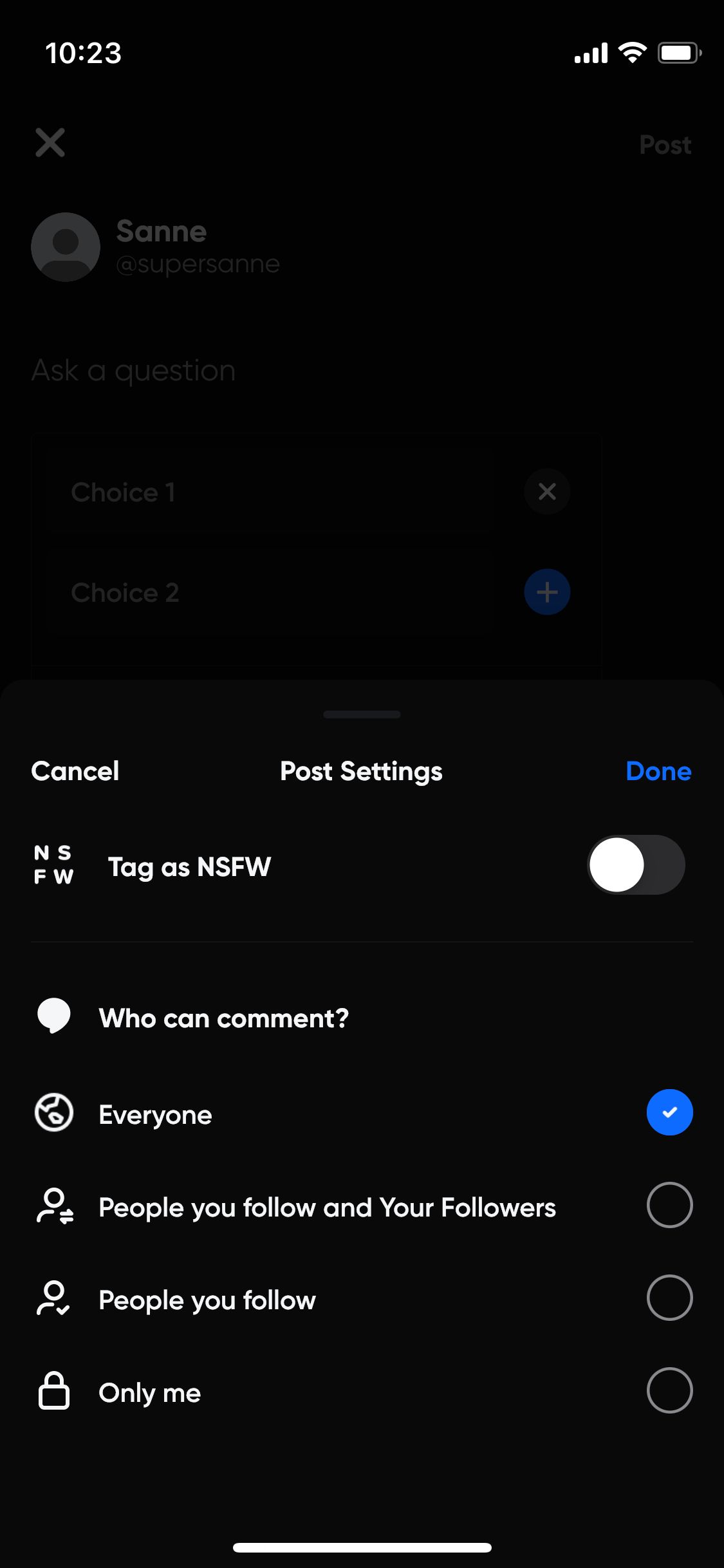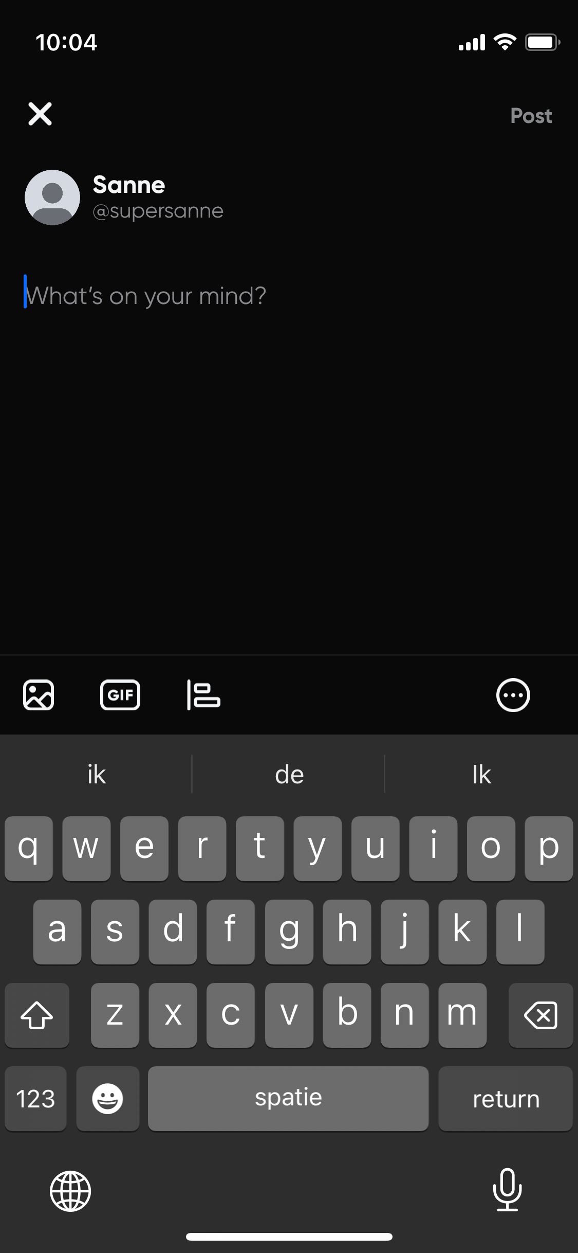 Via het plus-icoon kun je een update op Hive plaatsen. Deze functie doet mij meteen aan Twitter denken. Er komt een typevak in beeld met daarin de tekst ‘What’s on your mind?’. Hierin kun je tekst, afbeeldingen en/of een polletje plaatsen. Ook kun je bepalen wie er op jouw bericht kunnen reageren. Bijvoorbeeld alleen de personen die jij ook volgt.