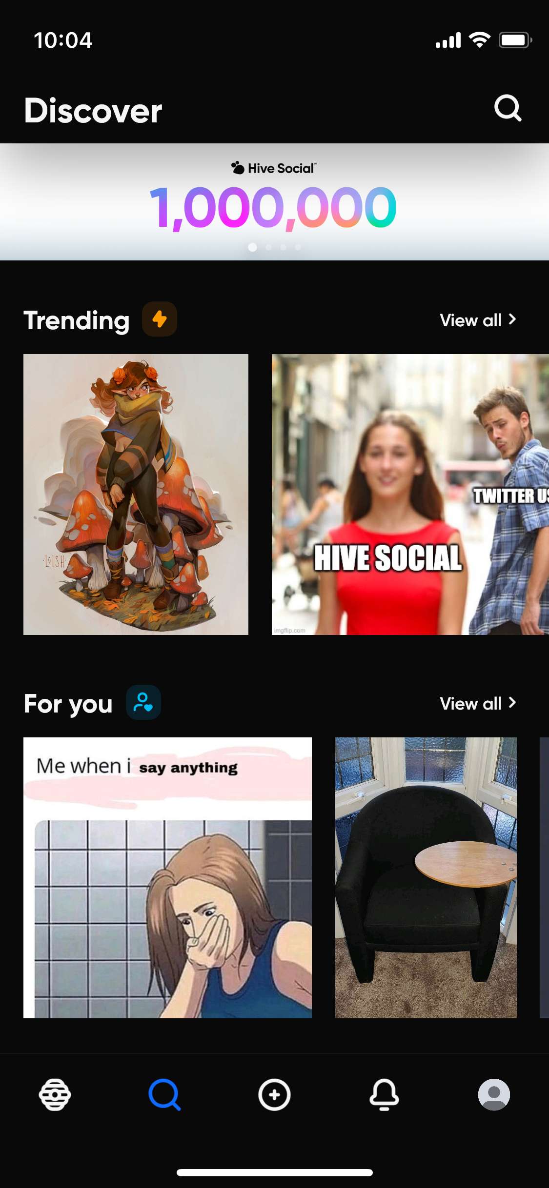 Via het vergrootglas (zie screenshot hierboven, de rechter afbeelding) kun je zoeken naar personen, categorieën en op keywords. Verder vind je op deze tab bovenaan aanbevelingen van Hive zelf, trending topics, ‘for you’-topics en nieuwe updates. Hieronder vind je berichten die passen bij de interesses die je tijdens het aanmaken van je account hebt ingevuld.