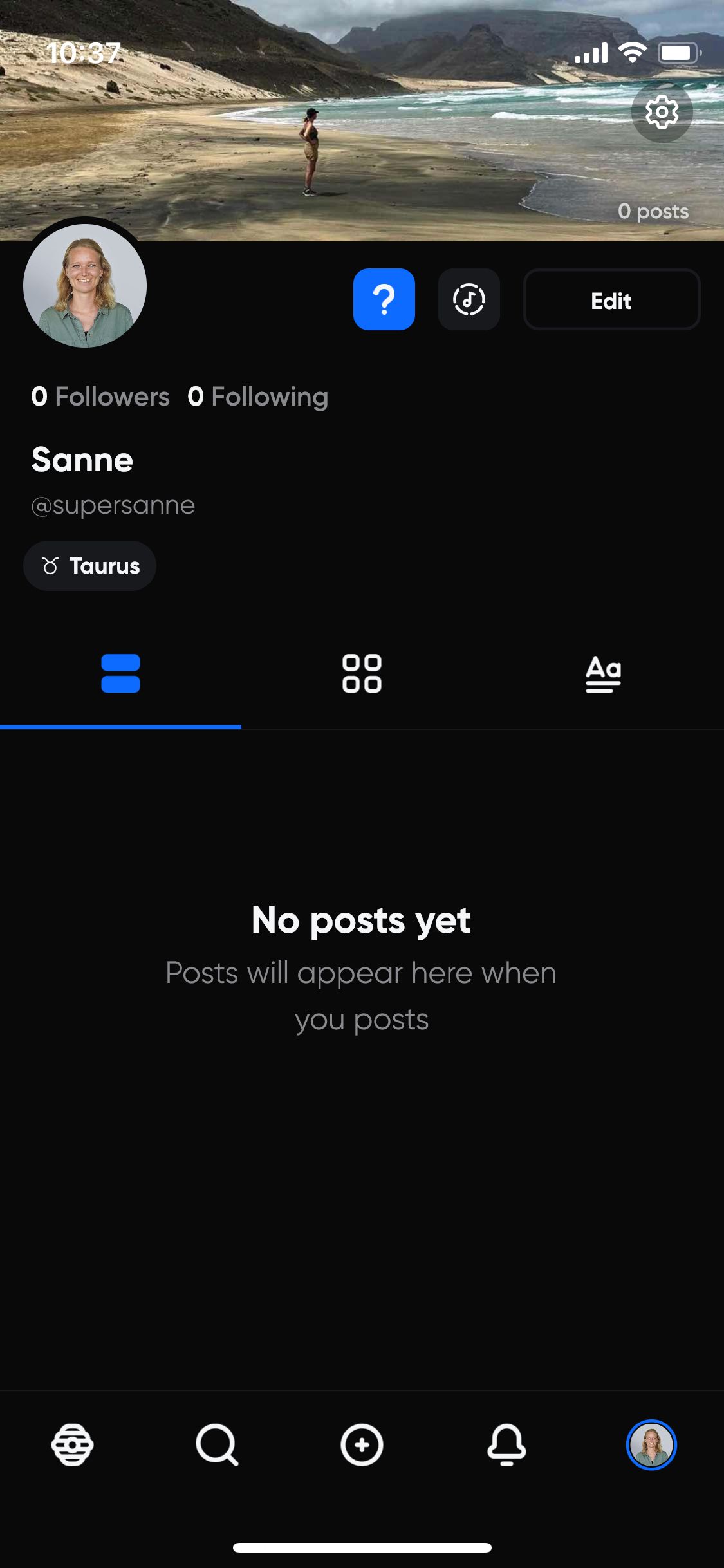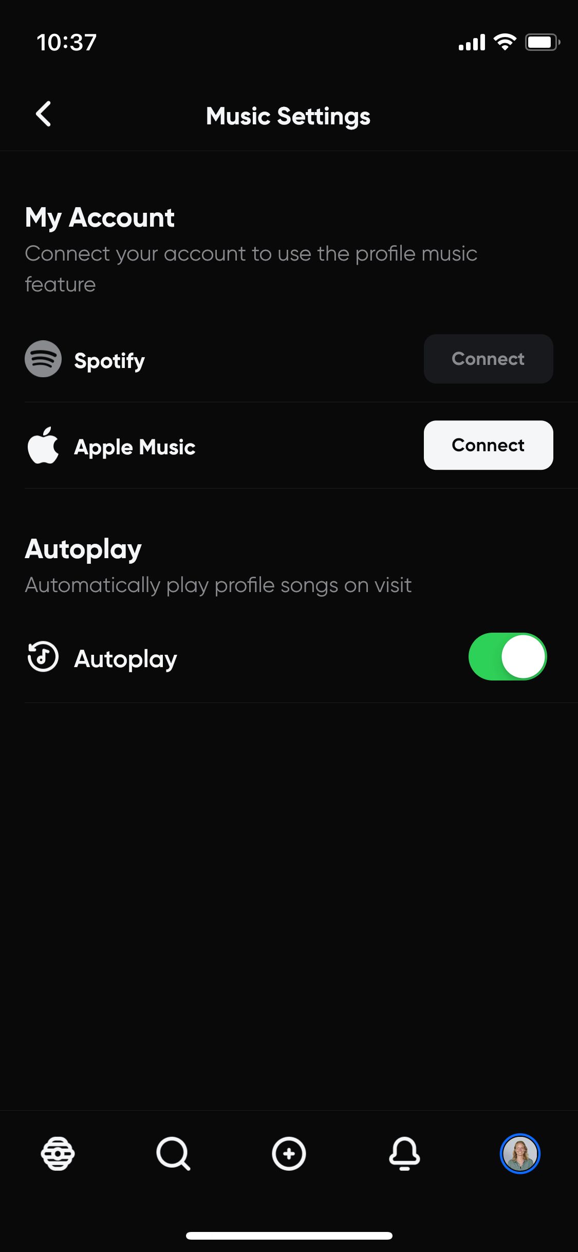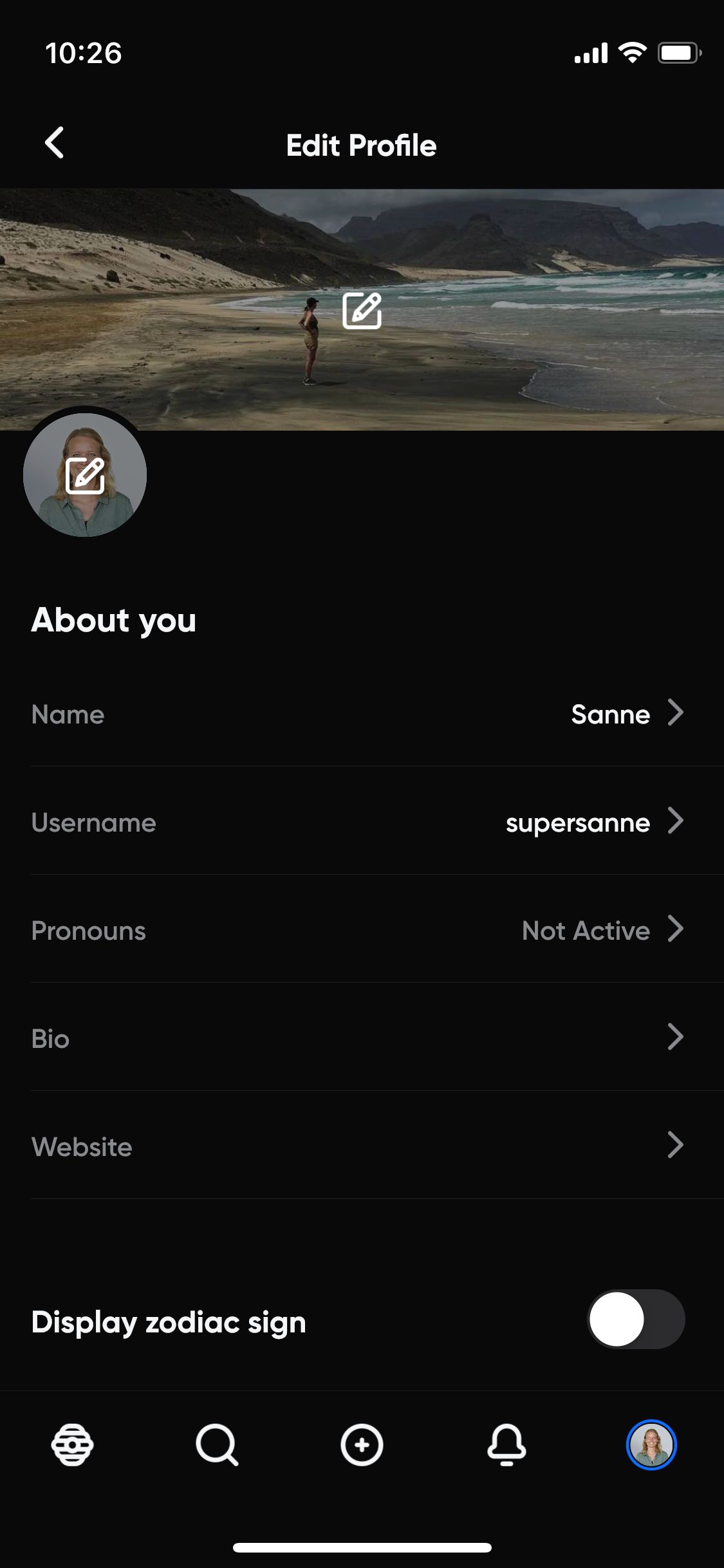 In de profiel-sectie voeg je een header-afbeelding toe, een profielfoto, je naam, username, pronouns, een biografie en je kunt ook een website toevoegen. En je kunt zelfs een schuifje aanzetten met ‘Display zodiac sign’. Vervolgens kun je via je profiel via een icoontje van een muzieknoot (dat een beetje op het TikTok-logo lijkt) je account koppelen aan Spotify en Apple Music.
