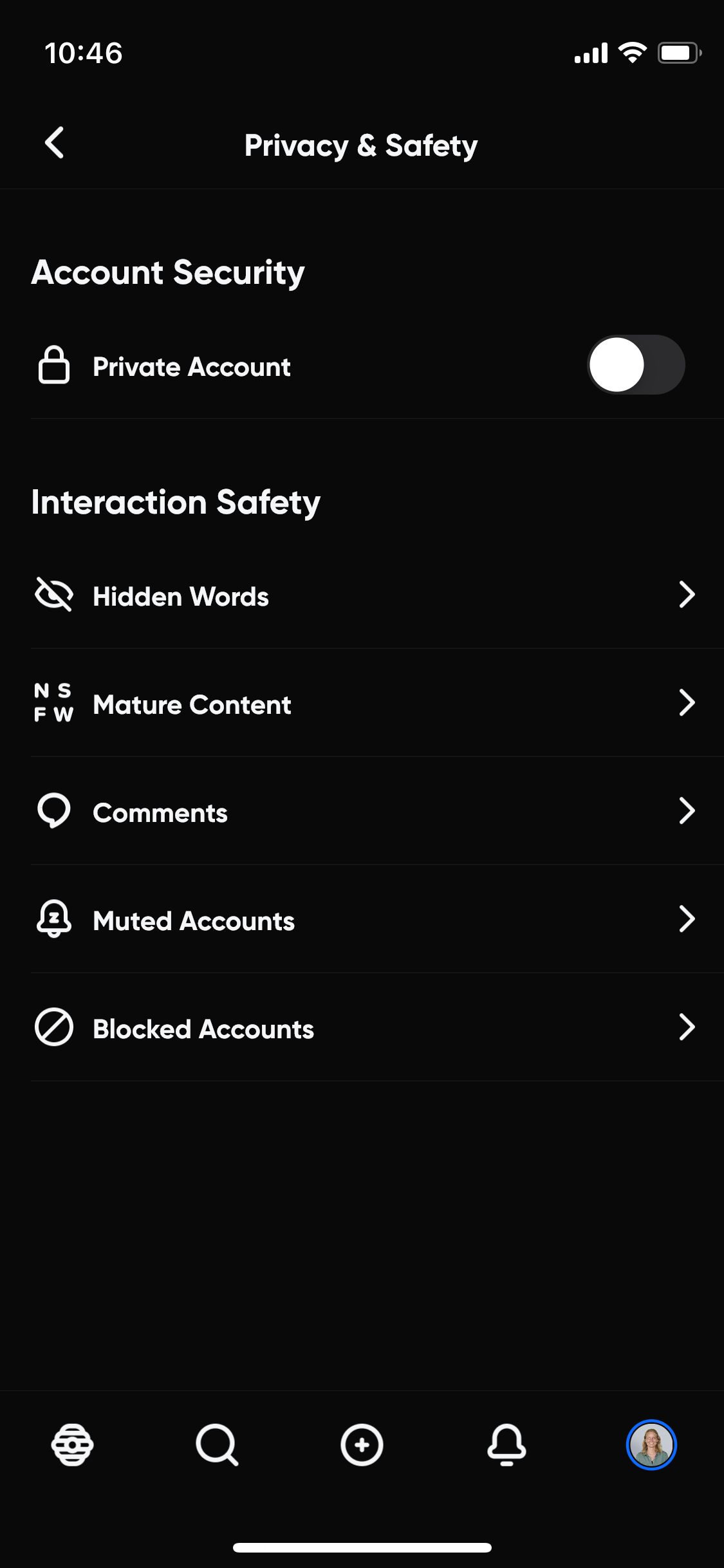 Via het tandwiel kom je bij de instellingen van Hive. Hier vind je de gebruikelijke instellingen, zoals je mailadres, telefoonnummer, geboortedatum (die je maar 1 keer kunt aanpassen) en je liked posts. De security, privacy en safety instellingen zijn summier, maar daardoor wel overzichtelijk. Zo kun je bijvoorbeeld instellen welke woorden je niet in de app tegen wil komen (Hidden Words) en je kunt ‘Mature Content’ aan of uitzetten (NSFW: not safe for work of not suitable for work). Op die manier zie je geen ongepaste updates op je timeline totdat je op ‘weergeven’ klikt.