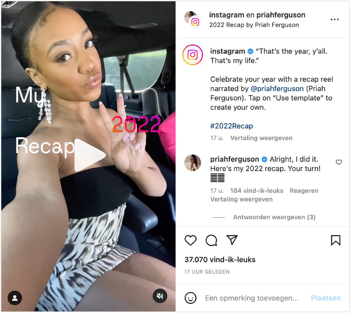 Recap: “This year was a ride! It came with highs and lows, but these special moments bring me joy. I’ve been looking back at the places I got to travel to, my birthday, my favorite looks, the epic premiere of Stranger Things, and tons of hilarious times with friends. My Reel shows some funny moments I haven’t shared on Instagram yet – I’m hyped to see people get creative and use my template to show off secret memories from their camera roll.”