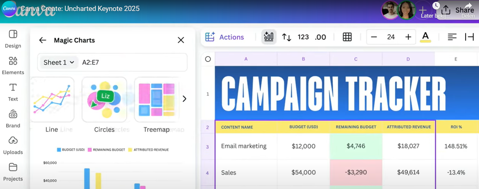 Een ander onderdeel binnen Canva Sheets is dat je je data makkelijker visueel kunt maken. Door de connectie met de Visual Suite 2.0 kun je je data in een ontwerp slepen of je data naast een ontwerp houden als basis.