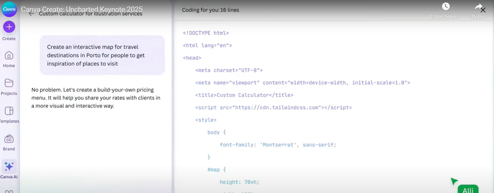 Deze optie vind je dan binnen de zoekbalk onder Canva AI en daar klik je op ‘Code for me’. Hier start je met het omschrijven van wat je precies wil bouwen. Dit kan alles zijn, denk bijvoorbeeld aan een quiz, een spelletje of een interactieve rekenmachine. Canva codeert dit vervolgens voor jou. Dit zorgt ervoor dat je niks meer over HTML’s of CSS’s hoeft te weten 😉.