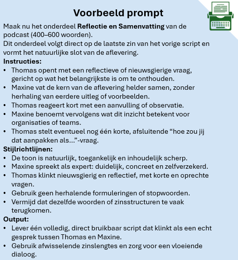 Door mijn agent waarin alle inhoud, beschrijving van de opbouw van de podcast en rolverdeling staat, samen met goede prompts per onderdeel van de podcast, krijg je goede scripts die ook echt ergens over gaan. Met dit script in de hand beland ik alleen wel in mijn volgende valkuil.
