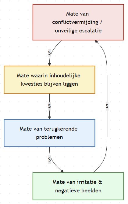 Het plaatje hieronder laat zien hoe conflictvermijding en onveilige escalatie ertoe leiden dat inhoudelijke kwesties blijven liggen (S). Daardoor komen dezelfde problemen steeds terug (S), wat irritatie en negatieve beelden versterkt (S). Die negatieve beelden maken het vervolgens nóg moeilijker om het gesprek op een rustige manier te voeren, waardoor conflicten óf weer worden vermeden óf juist verder escaleren (S). De neerwaartse spiraal gaat verder en verder.