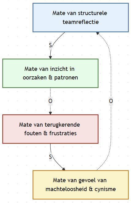 Het plaatje hiernaast laat zien hoe minder structurele reflectie leidt tot minder inzicht in oorzaken en patronen (S). Daardoor blijven dezelfde fouten en frustraties terugkomen (O). Dat vergroot het gevoel van machteloosheid en cynisme (S), en precies dat maakt het nóg moeilijker om energie vrij te maken voor reflectie (S). De lus voedt zichzelf. De neerwaartse spiraal gaat verder en verder.