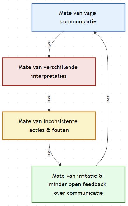 Het plaatje hieronder laat zien hoe vage communicatie leidt tot verschillende interpretaties, hoe die interpretaties uitmonden in inconsistente acties en fouten, en hoe dat weer irritatie oproept én terughoudendheid om de communicatie zelf ter discussie te stellen.
