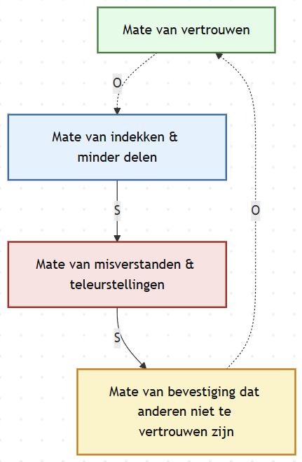 Het plaatje hieronder laat zien hoe minder vertrouwen leidt tot meer indekken en minder delen (Opposite), hoe dat weer zorgt voor misverstanden en teleurstellingen (Same), en hoe die ervaringen gezien worden als bevestiging dat anderen niet te vertrouwen zijn. Daardoor daalt het vertrouwen nog verder (Same) en wordt het indekgedrag sterker (Same). De neerwaartse spiraal gaat verder en verder.